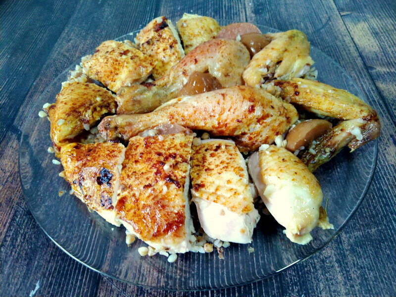 Гречку промыть и замочить, чтобы она стала мягкой, затем приготовить начинку из яблок в виде крупных долек. Курицу подготовить для фаршировки: аккуратно набить внутренность начинкой и закрепить швы. Кастрюлю или форму смазать лёгким слоем масла, уложить курицу спинкой вниз — так яблочный сок будет подпитывать мясо во время запекания.