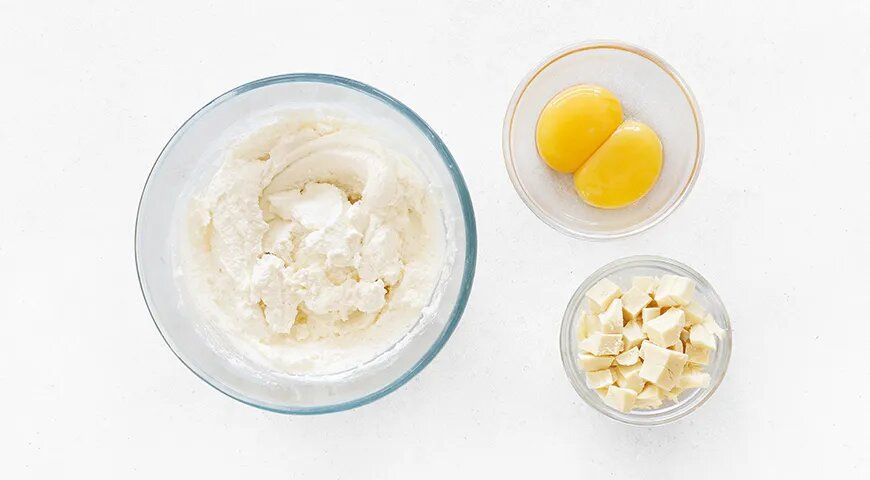 Шаг 1: Начните с нарезки шоколада на мелкие кубики. Творог следует протереть через сито или взбить в блендере до однородной массы. Яйца разбейте, отделяя белки от желтков, и уберите белки в холодильник — они пригодятся для глазури.