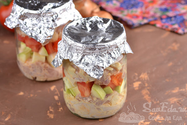 6. Завершите слоем оставшейся курицы. Важно не добавлять воду, так как такие продукты выделят сок во время процесса запекания. Не заполняйте банки до верха, чтобы избежать выкипания жидкости.
