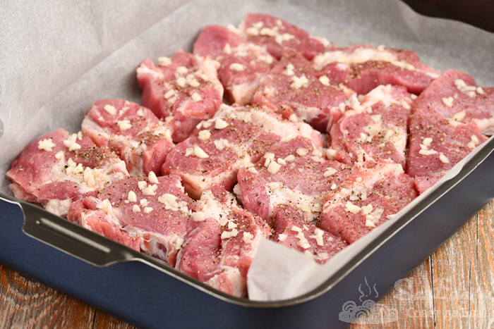 1. Свинина кусочками: Понадобится 900 г свинины (например, шейка). Нарежьте мясо на средние кусочки и уложите на пергамент в форме. Первым этапом — посолите, поперчите и добавьте мелко нарезанный чеснок (2 зубчика) с одной стороны, затем переверните и повторите. Закройте мясо второй частью пергамента, плотно прижав его к кусочкам, и запекайте при температуре 180 °C на протяжении 35 минут. В результате получится нежное мясо, пропитанное собственным соком и чесночным ароматом!