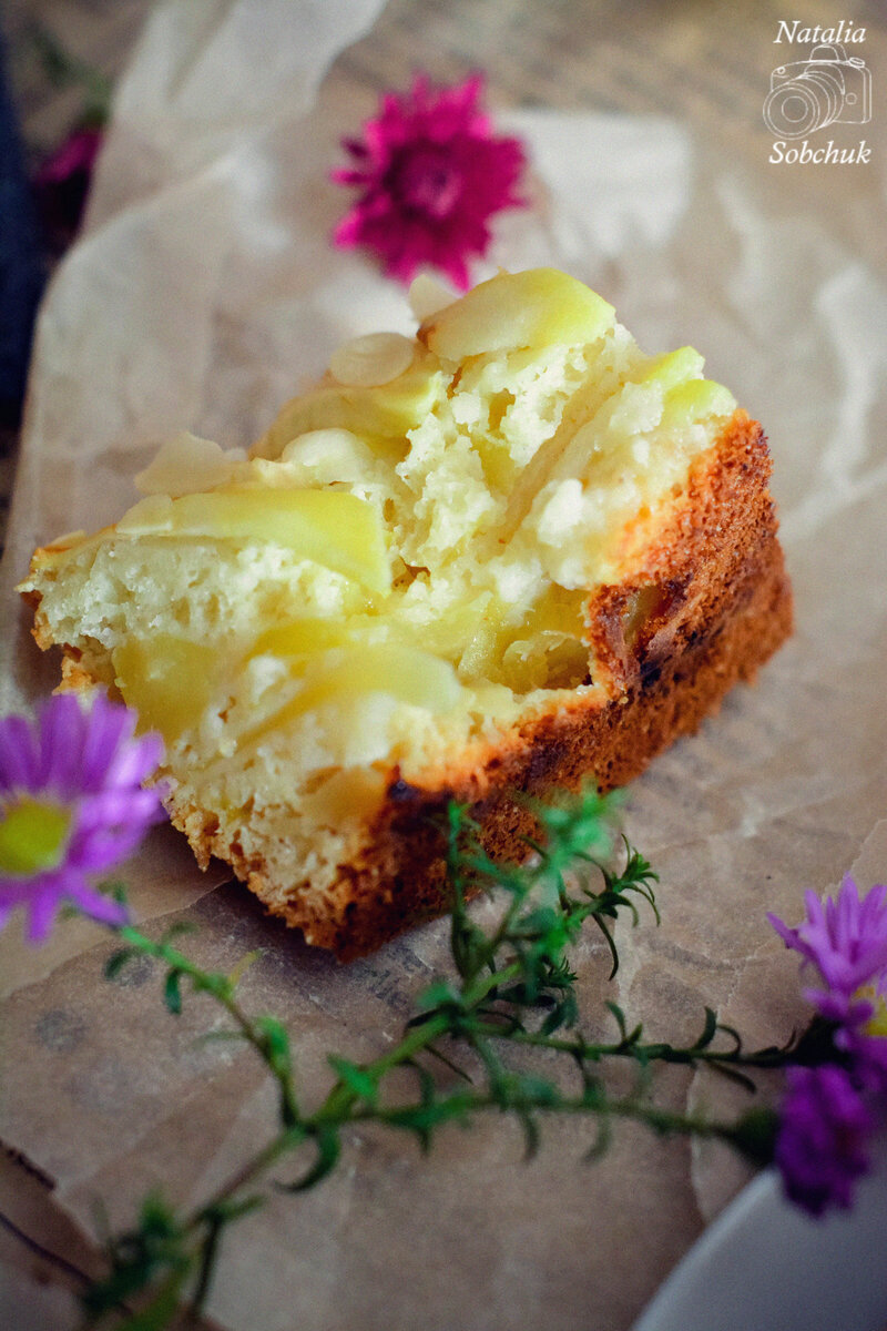 Застелите дно формы пергаментом. Вылейте половину теста, затем распределите половину яблок. Накройте оставшимся тестом и красиво уложите оставшиеся дольки по кругу. По желанию можно посыпать миндальными лепестками. Выпекайте в заранее разогретой до 180°С духовке около 50 минут. Проверьте готовность, проткнув тесто деревянной палочкой – она должна остаться сухой. Достайте готовую шарлотку из духовки, дайте ей немного остыть в форме, затем остудите на решётке.