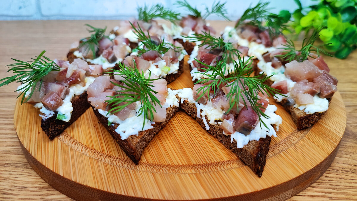 4. Сборка бутербродов: Нанесите начинку на обжаренные кусочки батона, сверху выложите кубики сельди и украсьте веточками укропа.