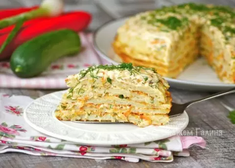 Готовые картофельные блины укладываются в несколько слоев, каждый из которых промазывается овощной начинкой. Итоговый шедевр можно украсить по желанию. Картофельный торт готов к подаче и, безусловно, станет любимым блюдом за семейным столом!