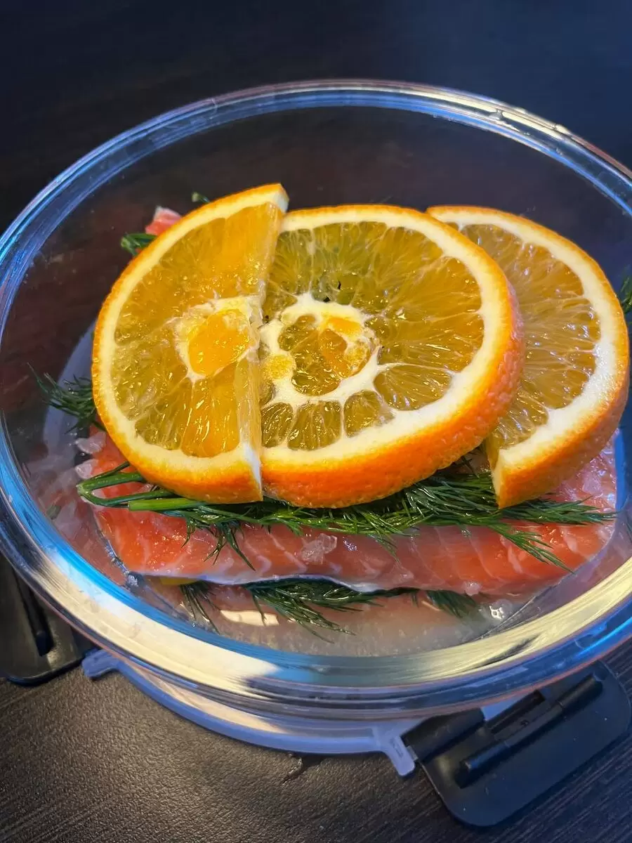 Красную рыбу лучше солить самостоятельно. Это не только удобно, но и экономично. На этот раз рыба была замаринована с добавлением апельсина, что принесло мягкий и свежий вкус.
