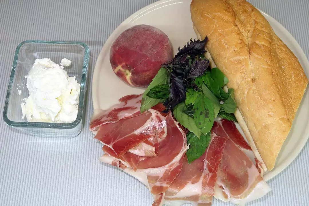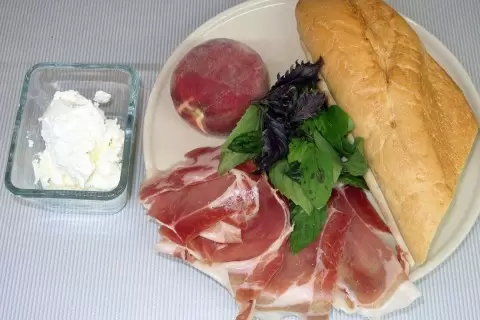 На каждый кусочек поджаренного хлеба наносится щедрый слой сливочного сыра. Сверху помещаются ломтики хамона, а на них — дольки персика. Завершает композицию веточка базилика, которая не только украшают, но и придают свежесть.