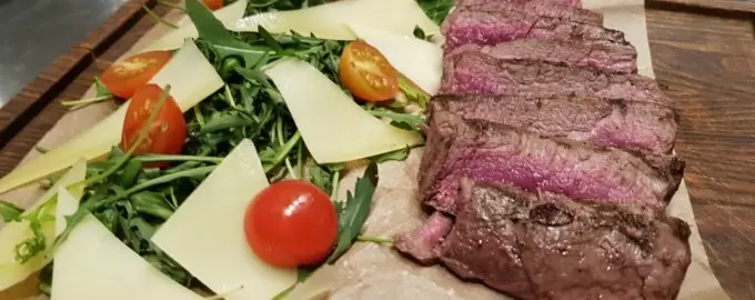 3. На сервировочную тарелку укладываются куски говядины полукругом. Рукколу заправляют и перемешивают, после чего кладут на мясо томаты, сверху располагается руккола и украшается пармезаном. Блюдо можно оформлять по своему желанию.