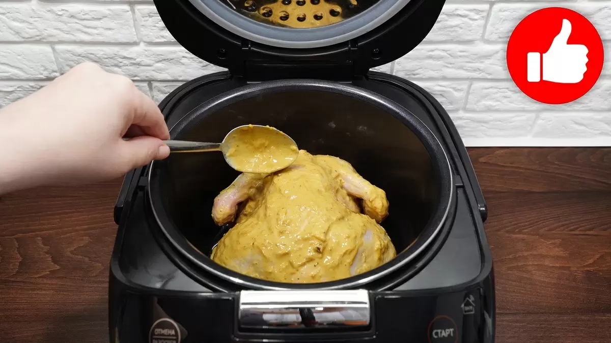 3. В чашу мультиварки налейте подсолнечное масло и аккуратно уложите курицу грудкой вниз. Сверху добавьте оставшийся маринад. Закройте крышку и установите режим «Выпечка/Мультиповар» с температурой 130 градусов на 1 час и 10 минут. На 35-й минуте аккуратно переверните курицу, чтобы она равномерно подрумянилась с обеих сторон.
