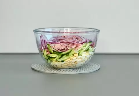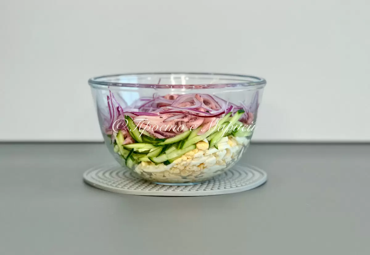 Пока лук маринуется, следует заняться остальными ингредиентами. Яйца нарезаются соломкой, а свежие огурцы также режут на тонкие полоски. Эти элементы придадут салату текстуру и свежесть.