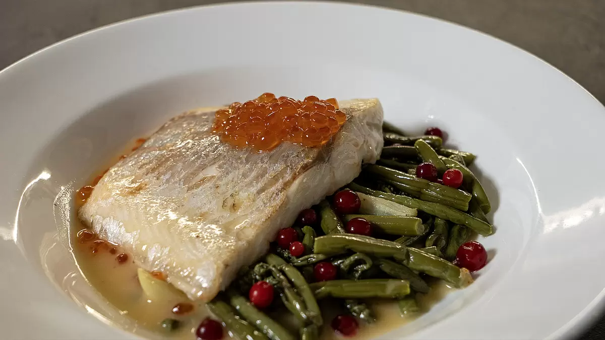На сервировочную тарелку выкладывайте обжаренный муксун и папоротник. Полейте соусом с икрой, а папоротник посыпьте свежей брусникой. Завершите композицию несколькими каплями кедрового масла. Приятного аппетита!