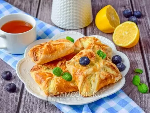 Важно подобрать хороший творог: он должен быть не слишком влажным, чтобы начинка не растекалась. А слоёное тесто перед использованием стоит заранее разморозить.