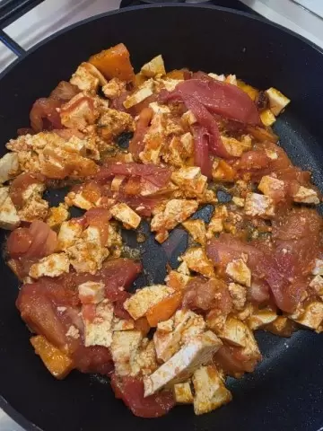 - Следующий шаг — раскрошить тофу, впустить его в танец с томатами и продолжать тушить несколько минут, чтобы компоненты объединились.