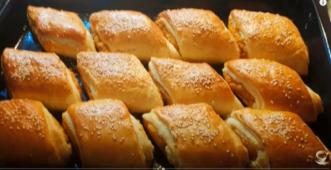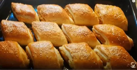 После того как тесто охладится, разделите его на три равные части. Каждую часть тонко раскатайте, смазав растительным маслом, и снова уберите в холодильник на некоторое время. Затем аккуратно положите начинку в центр, закатайте в рулет и нарежьте на порции. Выложите пирожки на противень, смажьте взбитым яйцом и, по желанию, посыпьте кунжутом. Выпекайте в предварительно разогретой до 180 градусов духовке около 25 минут.