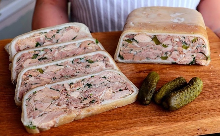 Форму ставим в холодильник на 20-22 часа. По истечении этого времени закуска будет готова — ее можно нарезать и подавать к столу. Это блюдо станет отличным дополнением к любому праздничному столу.