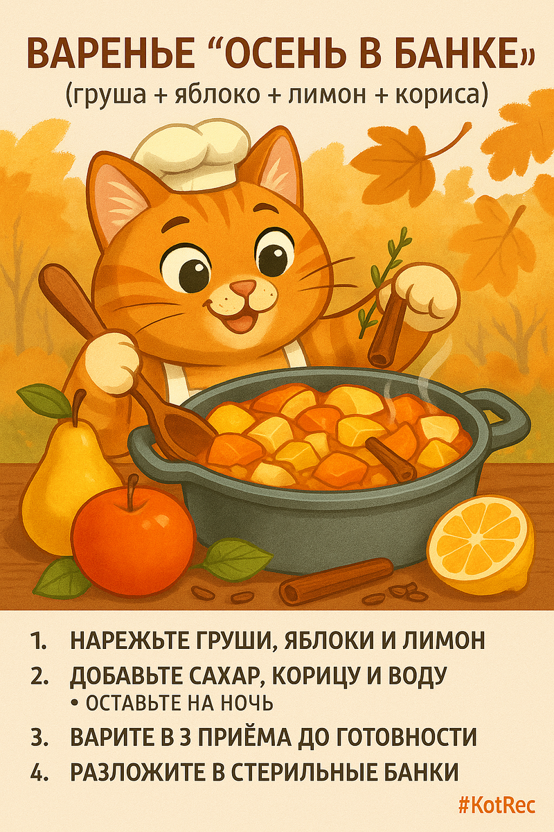 Подготовка фруктов: Тщательно вымытые яблоки и груши следует освободить от сердцевины и нарезать дольками толщиной 5-7 мм. Лимон нарезается кружками, предварительно удалив косточки.Приготовление сиропа: В кастрюлю налить воду, добавить сахар и корицу. Довести до кипения и варить 3-5 минут, пока не образуется ароматный сироп.Добавление фруктов: Влить фрукты в сироп и оставить на 6-8 часов или на ночь для насыщения.Варка: Процесс варки проходит в три этапа: первый — кипятить 10 минут, затем охладить; второй — опять кипятить 10 минут и снова охладить; третий — варить 15 минут до получения карамельной густоты. Это сохранит фрукты целыми и прозрачными, а сироп подарит удивительный янтарный цвет.Консервация: Разлить горячее варенье по стерилизованным банкам и закрутить крышками. Перевернуть и укутать, дав полностью остыть.Для улучшения вкуса можно добавить щепотку ванили или орехи на финальном этапе. Сорт яблок с высоким содержанием пектина гарантирую получение более густого варенья. Каждая ложка этого лакомства станет настоящим глотком сладости и тепла, наполняя осень удивительными ароматами и вкусами.
