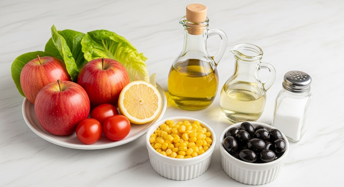 Кукуруза консервированная 200 г, яблоки две штуки, помидоры два средних, маслины 200 г, листья салата по вкусу, растительное масло 2 ст. л., лимонный сок 2 ст. л., соль по вкусу. Свежесть и яркость достигаются за счет свежего лимона и качественного масла.