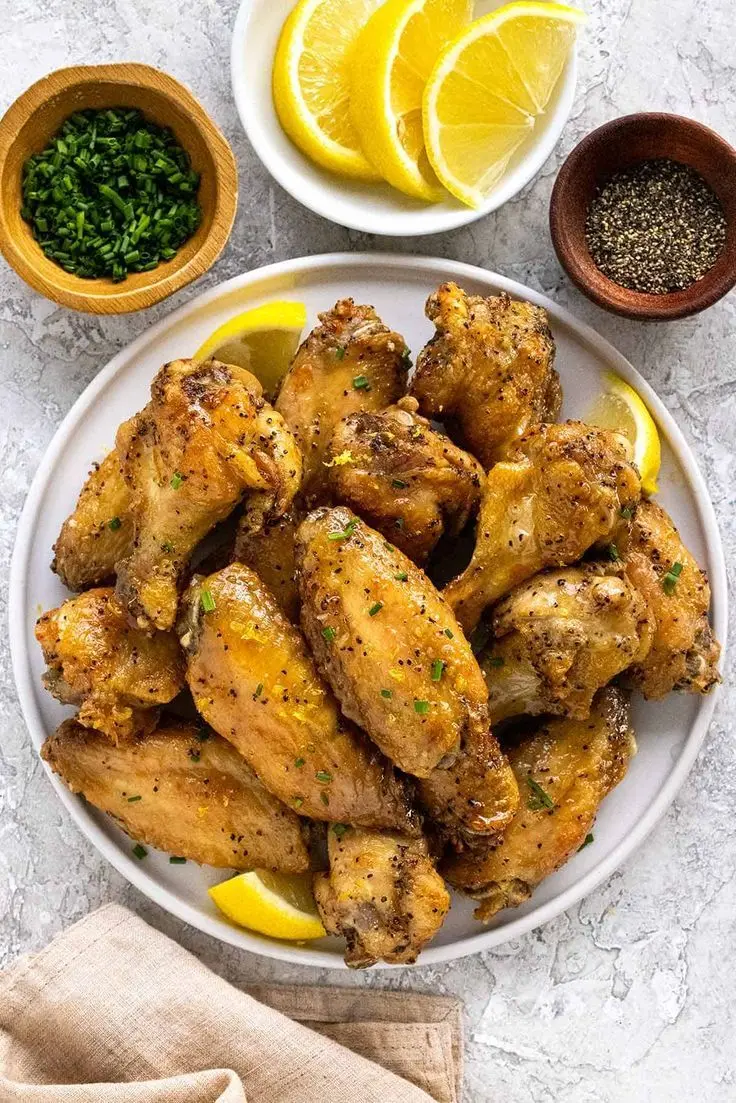 Крылышки подаются с ломтиками лимона и свежей зеленью. Их можно дополнить гарниром из зеленых салатов, отварного риса или картофеля.