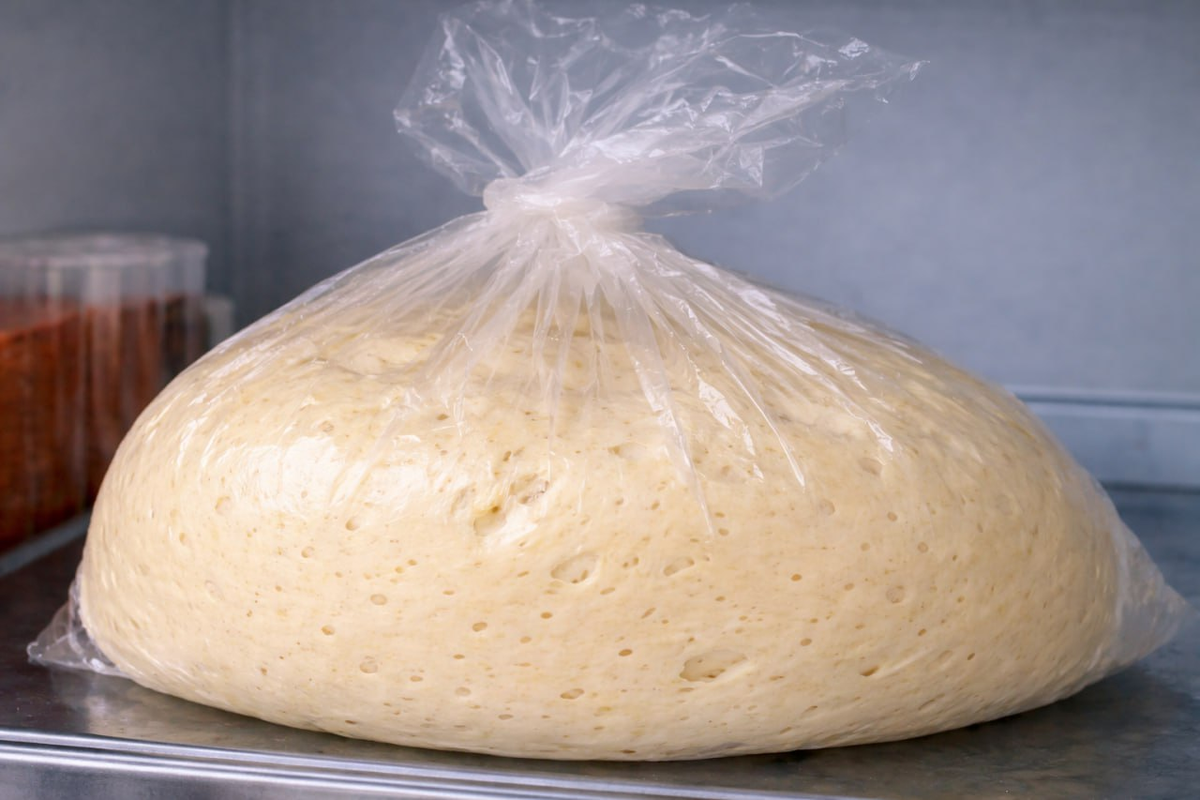 4. Переложите готовое тесто в заранее смазанный растительным маслом пакет, завяжите, оставив немного места для подъёма, и отправьте в холодильник. Тесто станет больше в два-три раза за несколько часов, но может спокойно находиться там до суток.