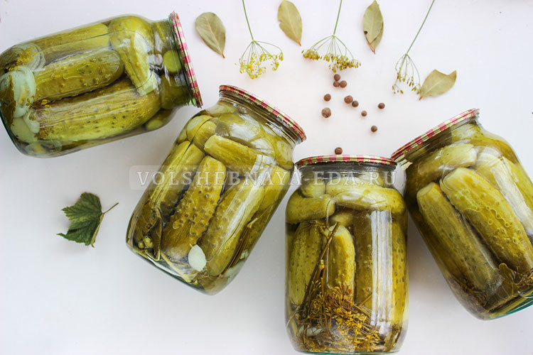 Для маринада смешивают воду с солью и сахаром, доводят до кипения и добавляют уксус. Готовым маринадом заливают огурцы в банках, закрывают крышками и переворачивают на сутки, завернув в теплое полотенце. После полного остывания банки следует переместить в прохладное место для хранения.