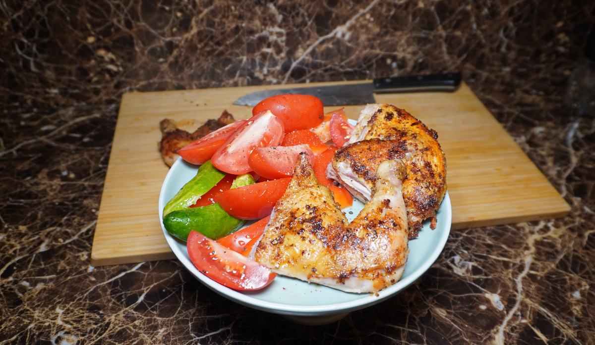 1. Начните с подготовки тушки: аккуратно разрежьте грудку пополам и расправьте ее. Затем обмажьте мясо оливковым маслом и равномерно распределите специи — не забудьте про соль, черный перец, копченую паприку, прованские травы и сушеный чеснок.