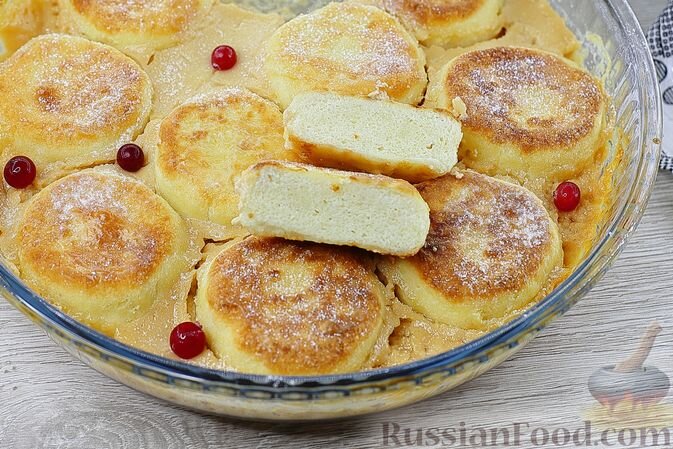 Запечённые сырники подаются с сметаной и сгущённым молоком, создавая изысканный десерт, который станет отличным дополнением к любому сладкому столу.