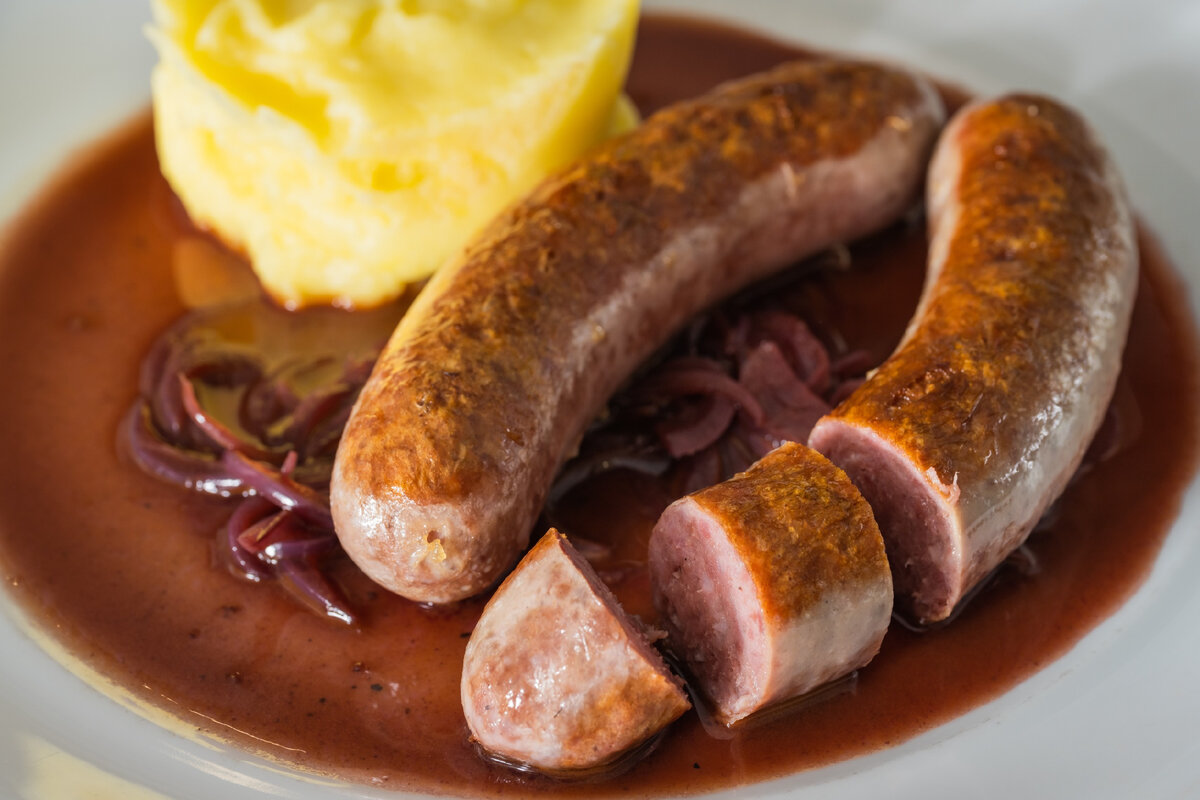 В основе блюда лежат магазинные колбаски, которые обжариваются на гриле или запекаются в духовке, а соус готовится из большого объема красного лука, обеспечивая сладковатый пикантный вкус. Для карамелизации используем коричневый сахар, который подарит соусу глубину вкуса, в то время как красное сухое вино и некоторые капли винного уксуса балансируют общий вкус.