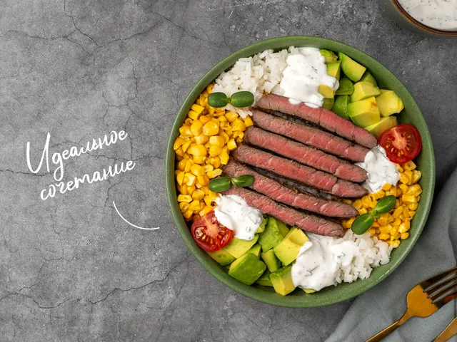 Этот боул поражает изобилием вкусов и ароматов, в центре которого — нежный стейк, обладающий богатым вкусом. С ним гармонично соседствуют запеченная кукуруза и гладкий авокадо. Такой комплект станет отличным вариантом для сытного обеда или ужина, а при желании его можно дополнить консервированной фасолью и помидорами черри.