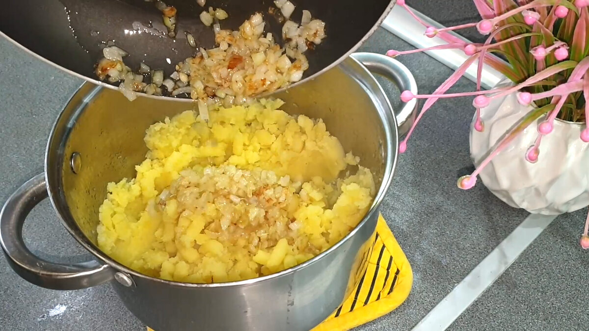 Лук нарезается мелкими кубиками. Разогрейте сковороду с 2 столовыми ложками растительного масла и обжарьте лук до золотистого цвета, добавив немного черного перца для аромата. Соедините лук с картофелем и тщательно перемешайте, подкорректировав вкус солью.