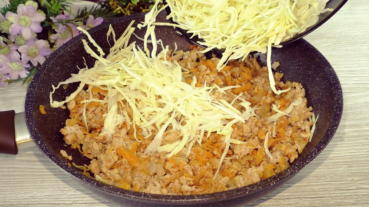 Процесс приготовления включает обжаривание овощей и фарша, после чего следует добавить капусту. В это время замешайте тесто, смешивая все ингредиенты. Как только начинка готова, залейте её тестом и готовьте под крышкой на маленьком огне около 25 минут. После этого переверните пирог и доведите до готовности.