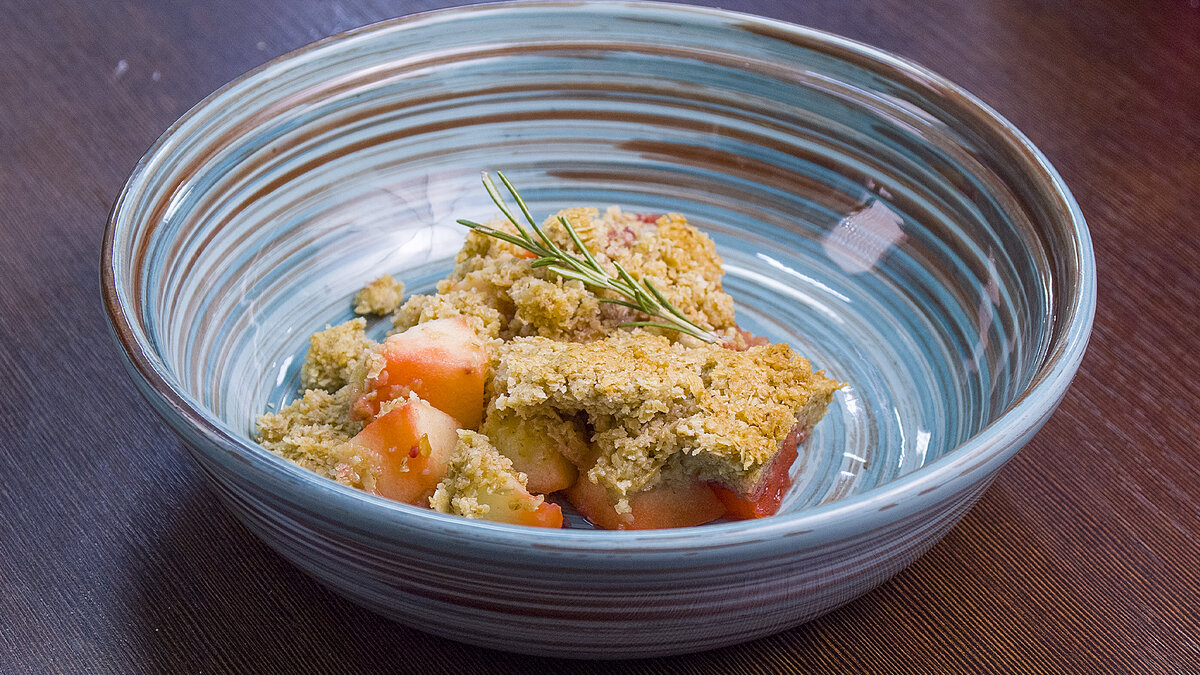 Готовый крамбл аккуратно перенесите на тарелку, украсив свежими листиками мяты или розмарина. Подавайте к столу и наслаждайтесь невероятным вкусом этого английского десерта!