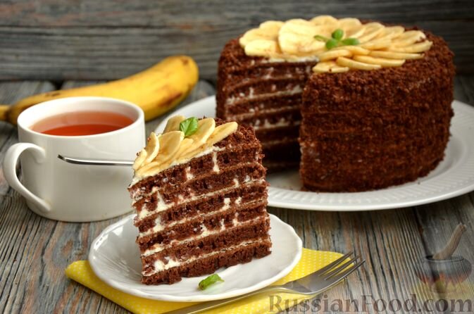- Ингредиенты: мука, сахар, молоко, яйца, какао-порошок, ванильный сахар, разрыхлитель, сода, растительное масло, сметана, банан, свежий базилик и мята для украшения.