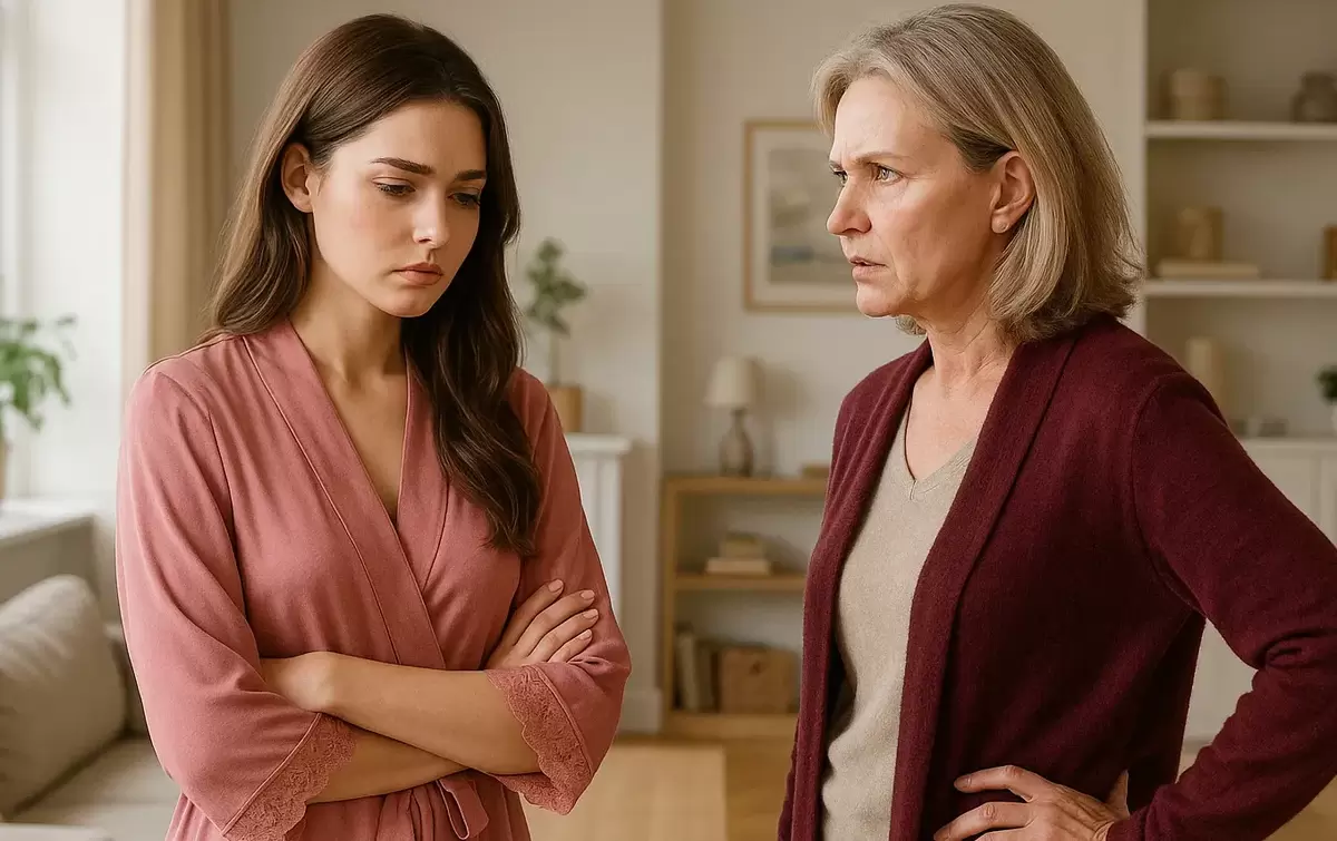 На кухне звучит голос Татьяны Павловны, обладающей строгим характером и педагогическим опытом. "Олечка, ты всё еще в халате?" — с укором спрашивает она невестку, которая сосредоточена на работе.