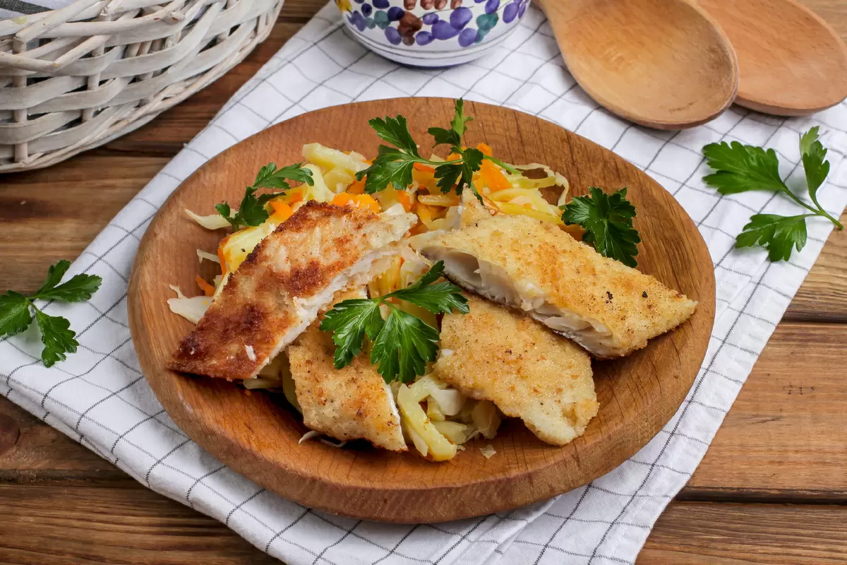 3. Приготовление рыбы. Филе хека проверяют на наличие костей и при необходимости удаляют их. Рыбу приправляют солью и перцем. В одной миске взбивают яйцо, в другую кладут муку, а в третью — панировочные сухари. Разогревают сковороду с растительным маслом и обваливают рыбу сначала в муке, затем в яйце и, наконец, в сухарях. Обжаривают по 3-4 минуты с каждой стороны до золотистой корочки.