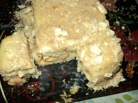 Теплый крем взбивается с размягченным маслом до однородной консистенции. Некоторые ложки крема оставляют для верхнего слоя. На дно формы выкладывают немного крема, затем чередуются слои печенья и крема, пока не закончатся ингредиенты. Обычно в большом торте получается около пяти слоев печенья, а в небольшом – четыре. Верх торта обмазывается кремом.