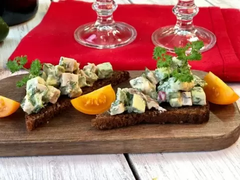 3. Выложите полученную смесь на ломтики хлеба. Для завершения оформления добавьте немного зелени и помидоры черри.