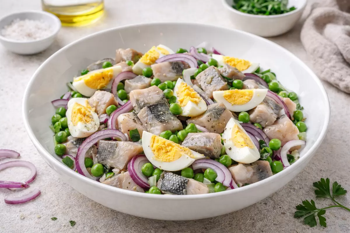 Необходимые ингредиенты: соленая сельдь, красный лук, вареные яйца и консервированный зеленый горошек. Этот набор продуктов всегда можно найти под рукой, а если чего-то не хватает – просто замените или добавьте по желанию. Главное – не стесняться экспериментов!