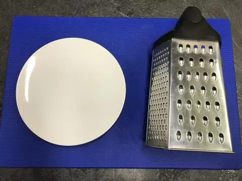 2. Теперь представляйте, что на дне тарелки – овощ, который хотите натереть. Проводите теркой по абразивной поверхности, как будто натираете морковь, делая плавные движения вперед и назад. Можно также просто положить посуду на стол и работать с теркой, двигая ее по дну тарелки.