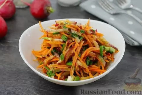 Для любителей острых и пикантных закусок подойдет салат, в состав которого входят свежие морковь и редис. Блюдо отличается насыщенным вкусом благодаря добавлению зеленого лука, чеснока и ароматных специй. Чтобы раскрыть весь потенциал вкусов, рекомендуется дать салату настояться в холодильнике около часа.
