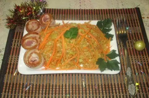 Салат заправляется получившейся смесью, делая его вкус насыщенным и гармоничным. Чеснок добавляет блюду особое обаяние — при желании его количество можно варьировать, или даже исключить. Подача может быть украшена яркими полосками моркови и свежей зеленью. Для любителей пикантных вкусов подойдут кусочки бекона, которые отлично дополнят блюда.