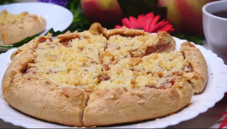 Украсив пирог крошкой, его отправляют в предварительно разогретую до 180 градусов духовку и выпекают около 30 минут, пока не появится золотистая корочка. Эффектная яблочная галета станет отличным дополнением к любому чаепитию!