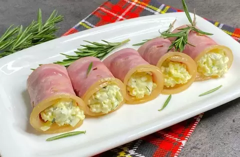 - Выложите яичную массу на край ломтика ветчины и аккуратно сверните в рулетик.