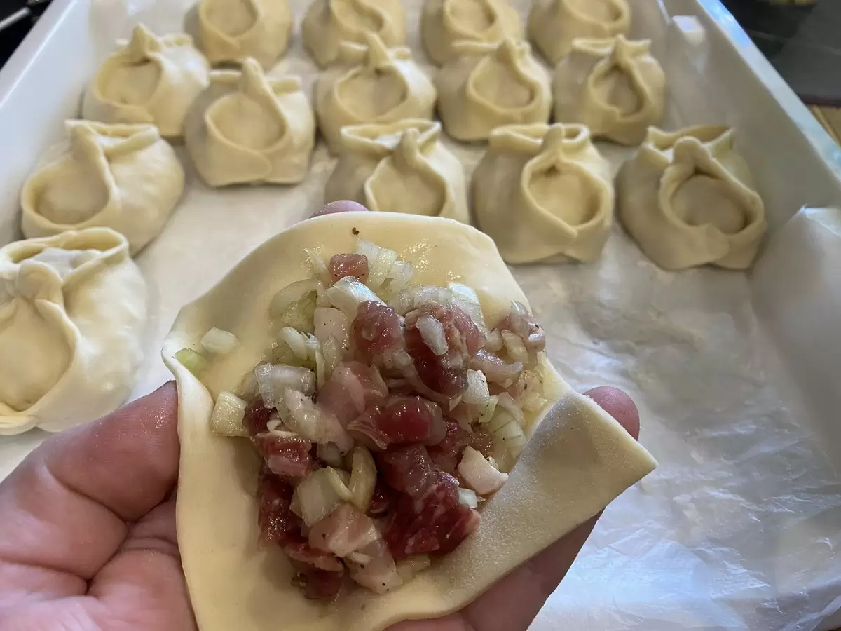 Лук является одним из ключевых ингредиентов начинки для мантов, и его должно быть не меньше, чем мяса — идеальное соотношение 50/50. Именно благодаря луку начинка обретает невероятную сочность.
