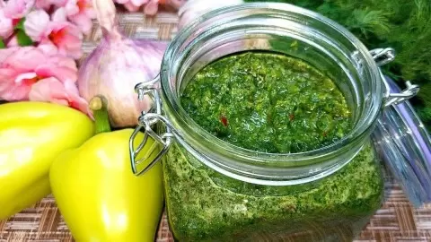 Зеленая аджика – это ароматная и пикантная приправа, способная добавить изюминку в любое мясное или овощное блюдо. Аджика, приготовленная без варки, сохраняет все полезные вещества и постепенно проникает во вкус продуктов. И что самое важное, она может храниться в холодильнике до самой весны.