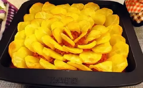 После этого формируется запеканка: мясная основа становится первым слоем, а картофельные кружочки раскладываются вертикально, создавая эффект цветка. Сверху можно посыпать тертым сыром для румяной корочки.