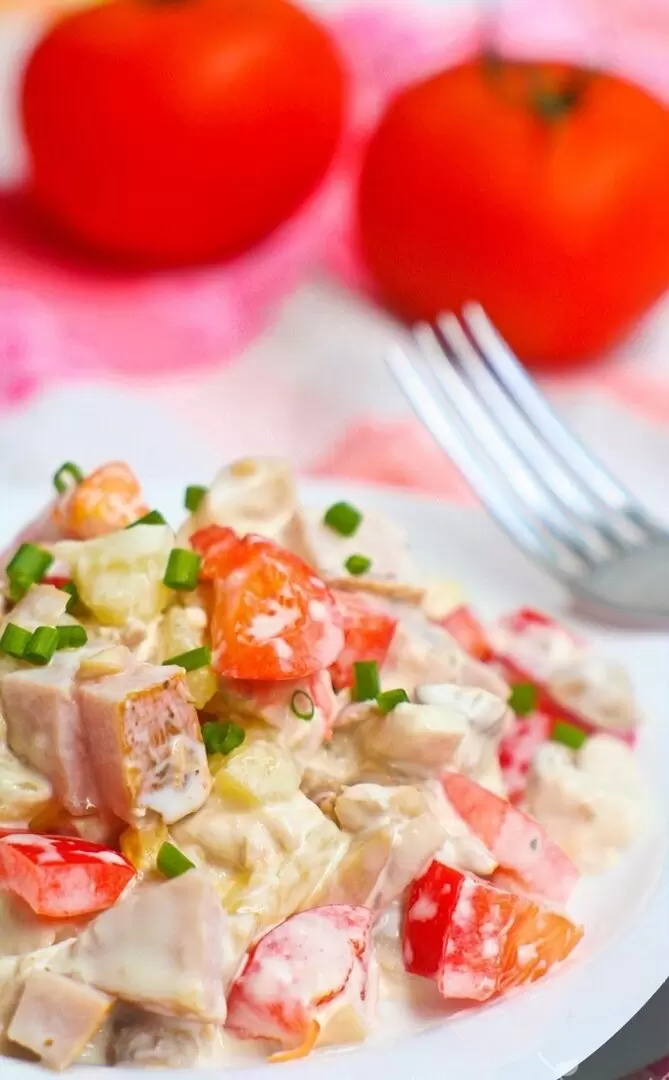 Этот салат впечатляет своим сочетанием вкусов и текстур, придавая нотку пикантности и свежести. Отлично подходит для подачи как холодной закуски. Приятного аппетита!